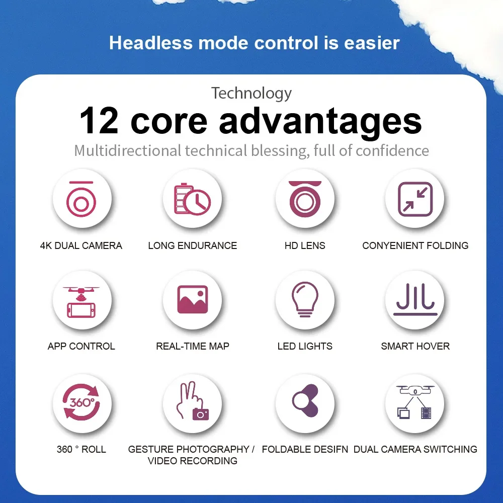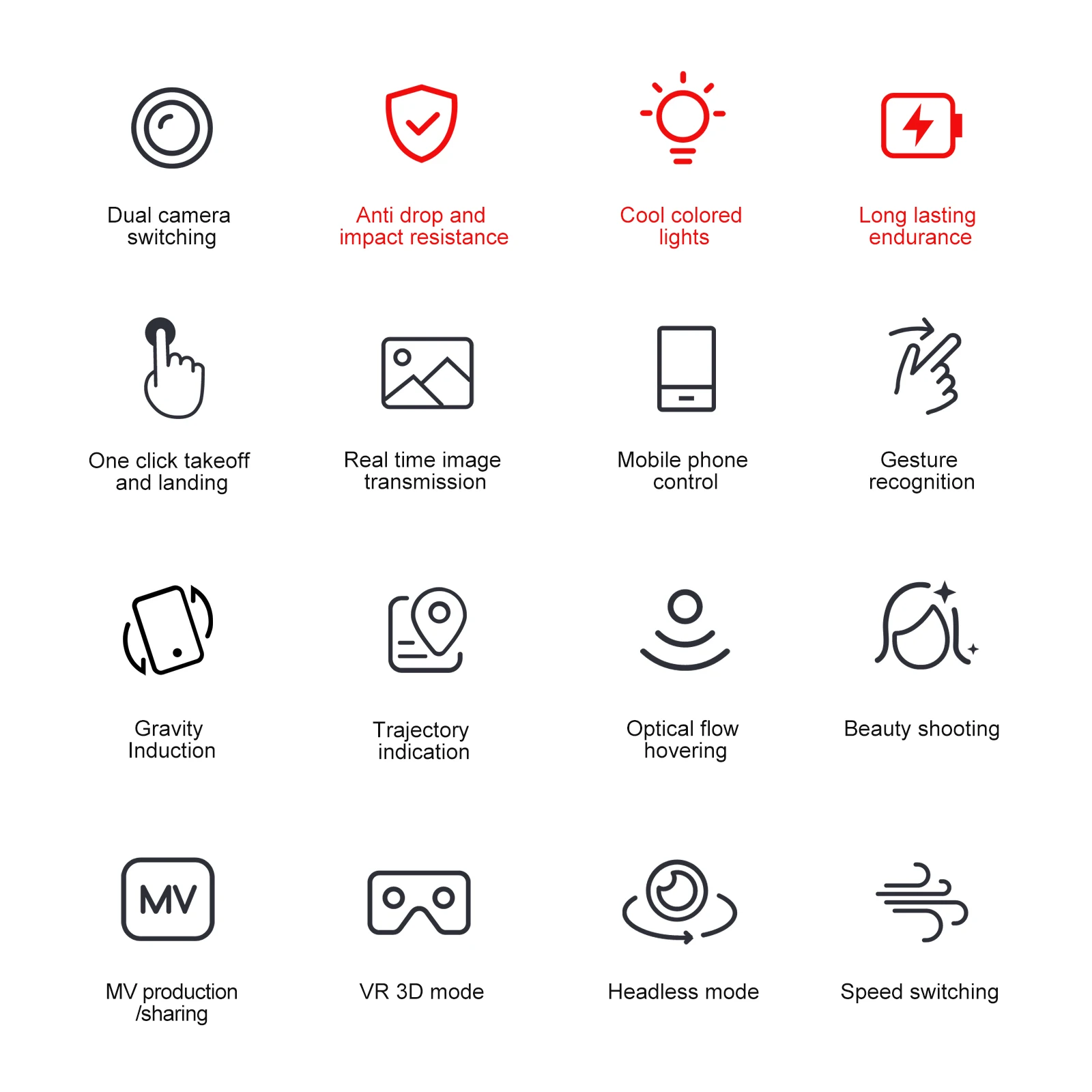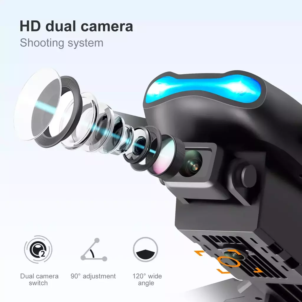 Comutação de câmera dupla, função de altura fixa, aeronaves dobráveis, seis passes com giroscópio; decolagem de uma tecla, pouso de uma tecla, subida e descida, para frente e para trás, lado esquerdo e direito voar, direção, modo sem cabeça (com câmera pode ser adicionado Funções: Fotografia gesto, vídeo, modo sem cabeça, parada de emergência, Trajetória voo, gravidade sensor, fotografia automática)