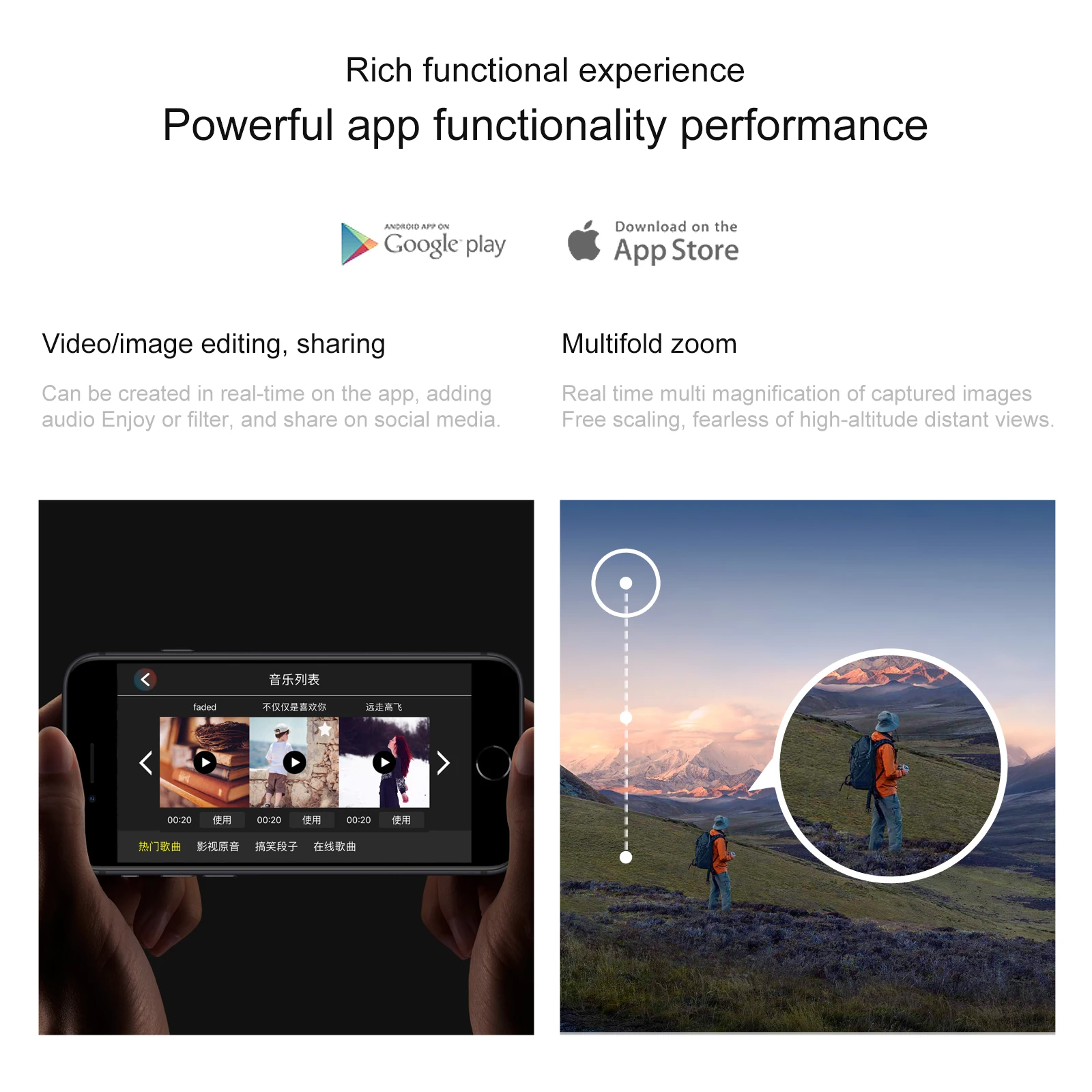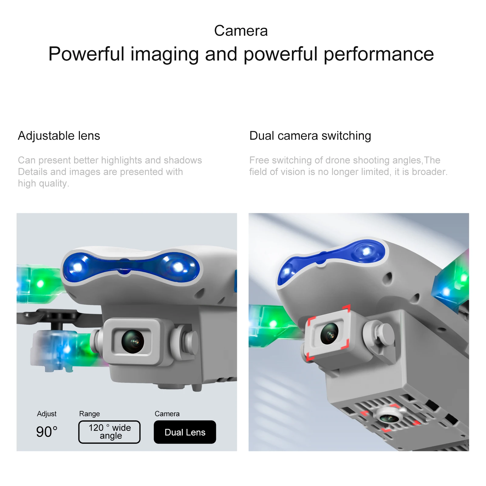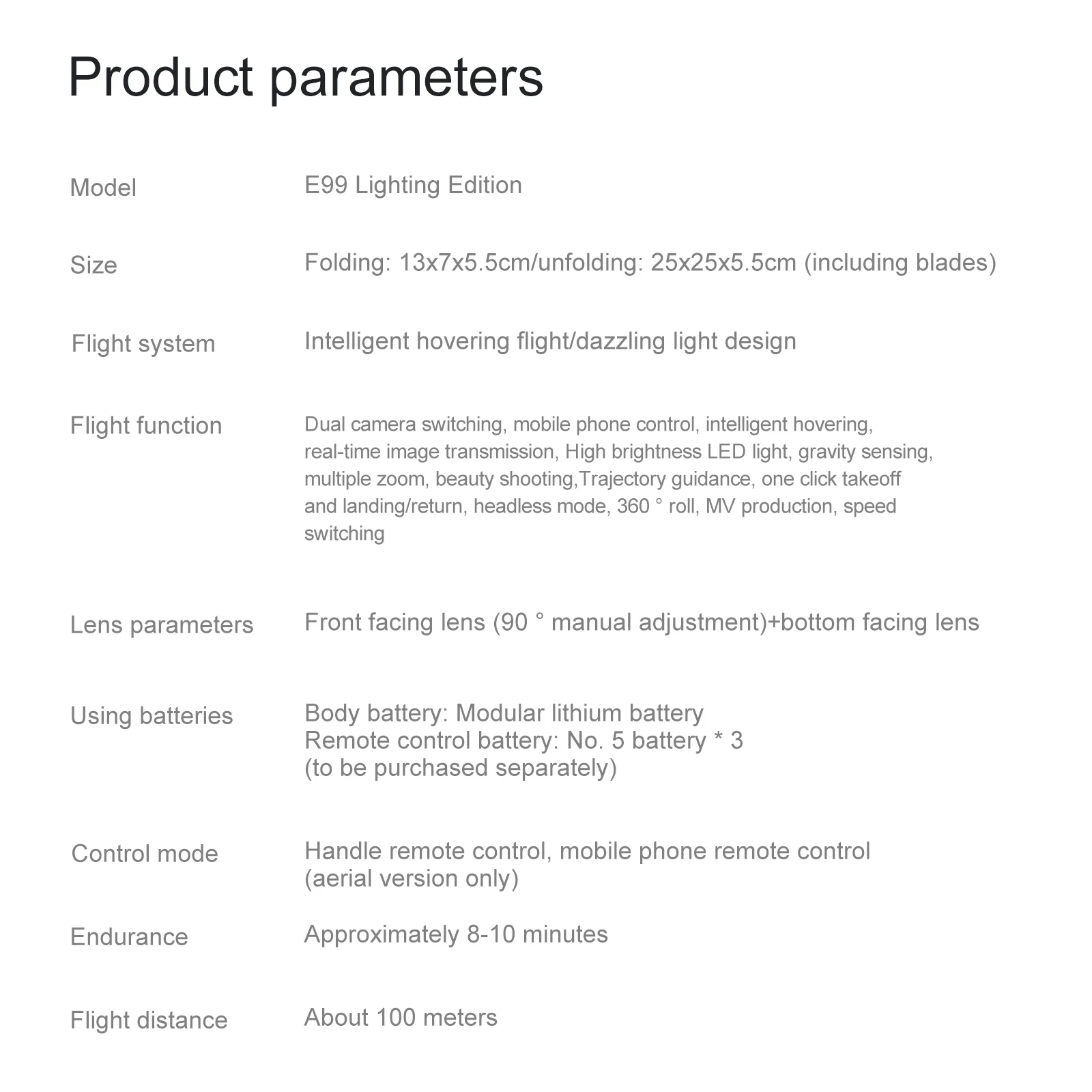 Comutação de câmera dupla, função de altura fixa, aeronaves dobráveis, seis passes com giroscópio; decolagem de uma tecla, pouso de uma tecla, subida e descida, para frente e para trás, lado esquerdo e direito voar, direção, modo sem cabeça (com câmera pode ser adicionado Funções: Fotografia gesto, vídeo, modo sem cabeça, parada de emergência, Trajetória voo, gravidade sensor, fotografia automática)