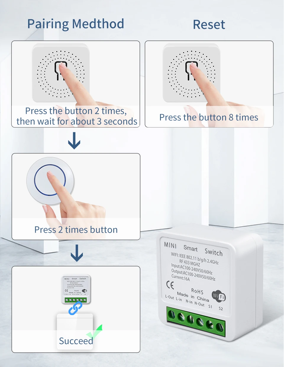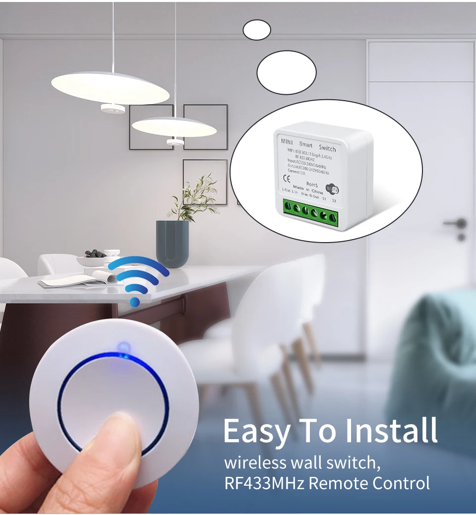O controlador do relé é WiFi + RF433MHz, o interruptor de parede é apenas RF433MHz. O mini interruptor redondo do botton próprio não pode controlar luzes sobre fora. Ele precisa trabalhar com o receptor WiFi + RF433MHz juntos.