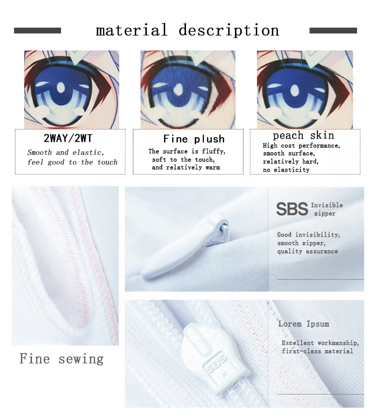 Tricot bidirecional: 80% ~ 85% para fibra de poliéster, 15% para spandex, com a vantagem de elasticidade de longo alcance, alta precisão e resistente a vincos, fresco no verão e quente no inverno, é o melhor material para o anime original caso de travesseiro.