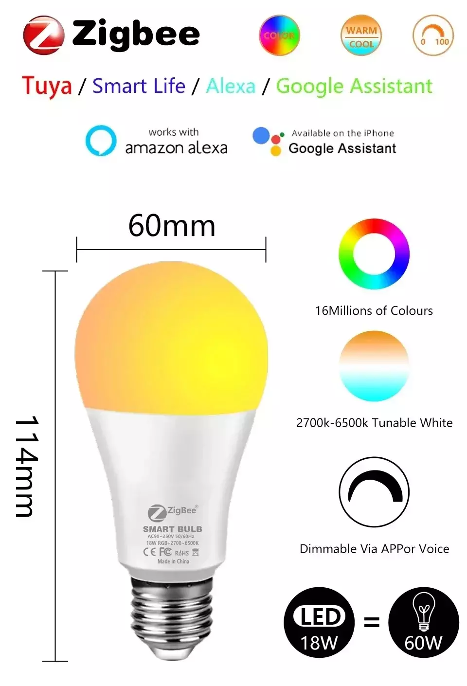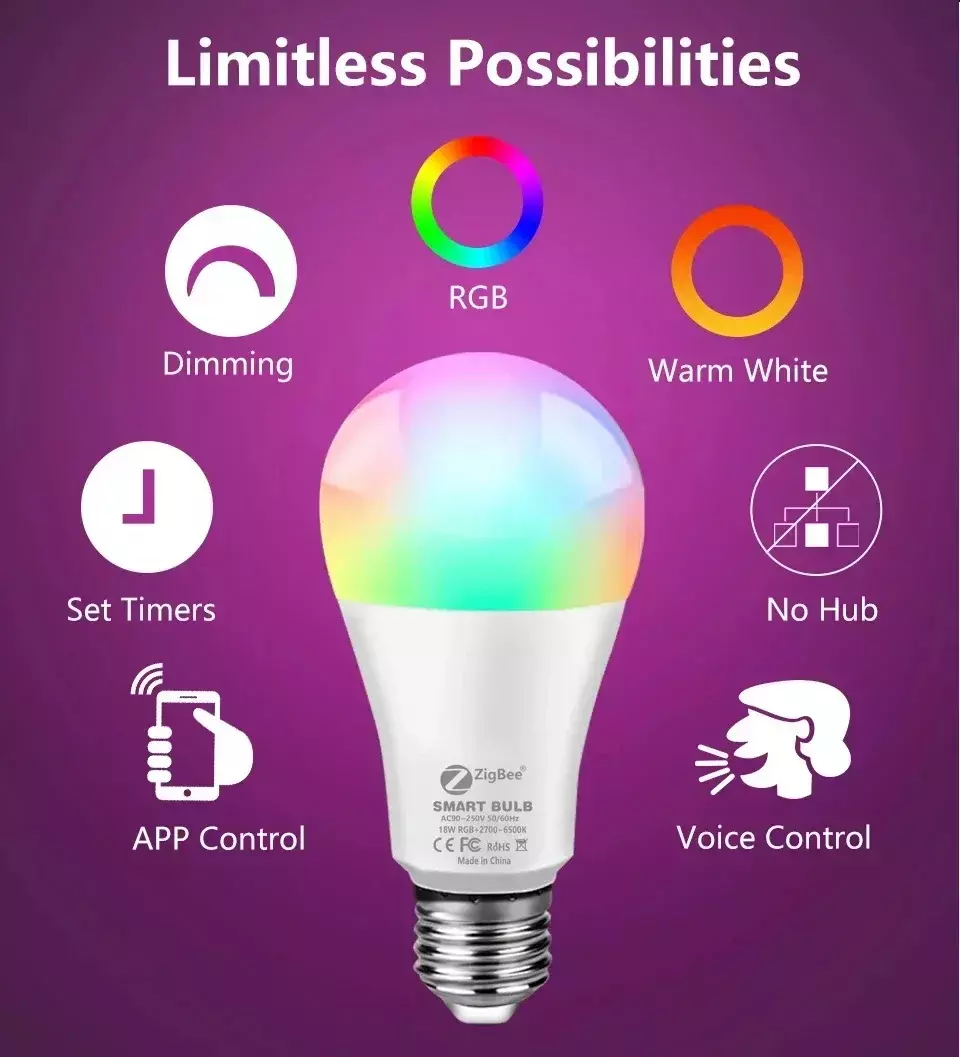 Aviso: Verifique se o seu roteador wifi é 2.4G. Se você não tiver um gateway zigbee hub, a lâmpada Zigbee não funcionará, basta comprar o tipo WiFi. Se você não tem nenhum jogador inteligente, como Amazon, Google, Yandex, por favor, basta comprar o tipo Bluetooth, então você controla pelo aplicativo. A lâmpada bluetooth não pode ser controlada por voz ou gateway.Tipo: Tuya Zigbee WiFi Bluetooth Lâmpada LED InteligenteMaterial: Aviação Alumínio, plásticoTipo do soquete: E26/E27Energia: 9WTensão: AC 85-265VLúmen: 100 lm/WVida: >50000hDownload do aplicativo: Smart Life/Tuya SmartRede: 2.4GHz Wi-Fi/Zigbee 3.0 (Hub zigbee é necessário)Cor clara: RGB + branco morno + branco (2700K-6500K)Função: Controle de Voz, APP Controle Remoto, Regulável, Compatível com o Amazon Alexa Echo Google Home AssistantComo se conectar com a vida inteligente APP?1. Baixe o aplicativo Smart Life, registre uma conta e faça o login2. Clique em "+" no canto superior direito-Adicionar manualmente-Iluminação-Iluminação (Wi-Fi)3. Gire sobre o interruptor 3 vezes: em-fora-em-fora-em até que pisque rapidamente4. Clique em "confirmar a luz pisca rapidamente" e insira a senha WiFi correta (2.4Ghz WiFi)5. Dentro de 30 segundos, será conectadoZigbee Hub Como Central de Controle: O Zigbee Gateway Hub é Necessário para a lâmpada Zigbee, atuando como a ponte central para todos os dispositivos zigbee com sinal extremamente estável e uma necessidade realmente boa para inteligência de toda a casa.