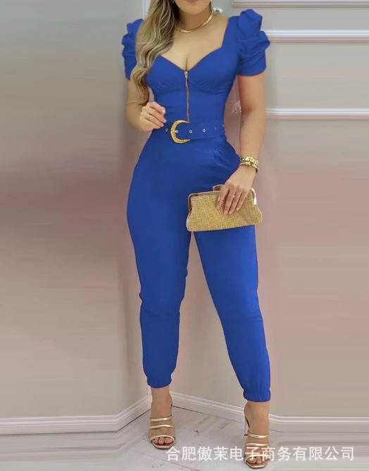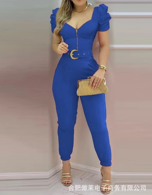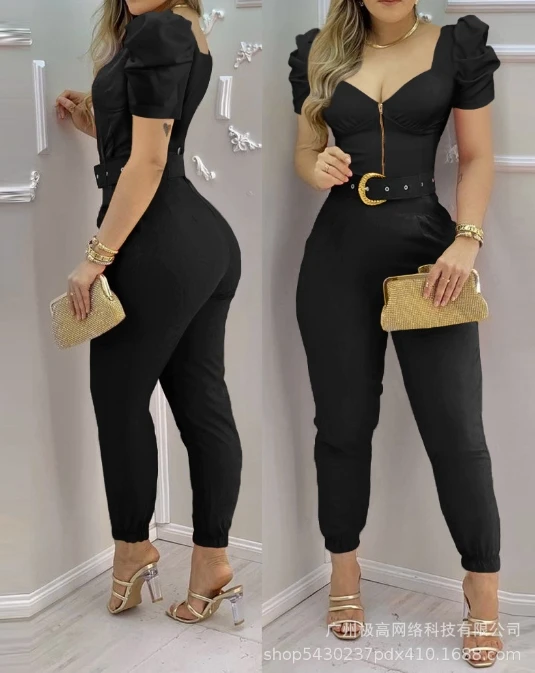 Mulheres estilo urbano macacão 2024 primavera verão mais recente temperamento britânico com decote em v mangas bolha macacão calças compridas apertado bodysuit