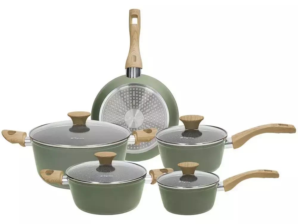O Jogo de Panelas Green Stone da Tognana é a escolha certa para a sua família. As panelas são usadas para preparar uma variedade de alimentos, desde sopas e ensopados até carnes grelhadas e fritas. Produzidas em alumínio na cor verde, com revestimento interno antiaderente marmorizado especial de 4 camadas e externo siliconada de alta temperatura sendo peças ótimas por não liberar produtos químicos nocivos nos alimentos. As tampas são em vidro temperado com saída de vapor, botão e pegadores em baquelite com acabamento soft touch antitérmicos, com toque macio e acabamento em imitação de madeira. São 5 peças: 1 frigideira, 1 panela com alça e tampa, 1 panela com alça e tampa, 1 panela com duas alças e tampa e 1 panela com duas alças e tampa. E para uma cuidador maior com as peças, antes de usar, lave o produto com água e detergente. Na primeira utilização, cubra a superfície interna com óleo. Repita este processo ocasionalmente. Cozinhe em temperatura média. Não aqueça o recipiente vazio. Não use produtos abrasivos para lavar. Embora o produto seja lavável na máquina de lavar louça, é preferível lavá-lo à mão para não alterar o seu revestimento.