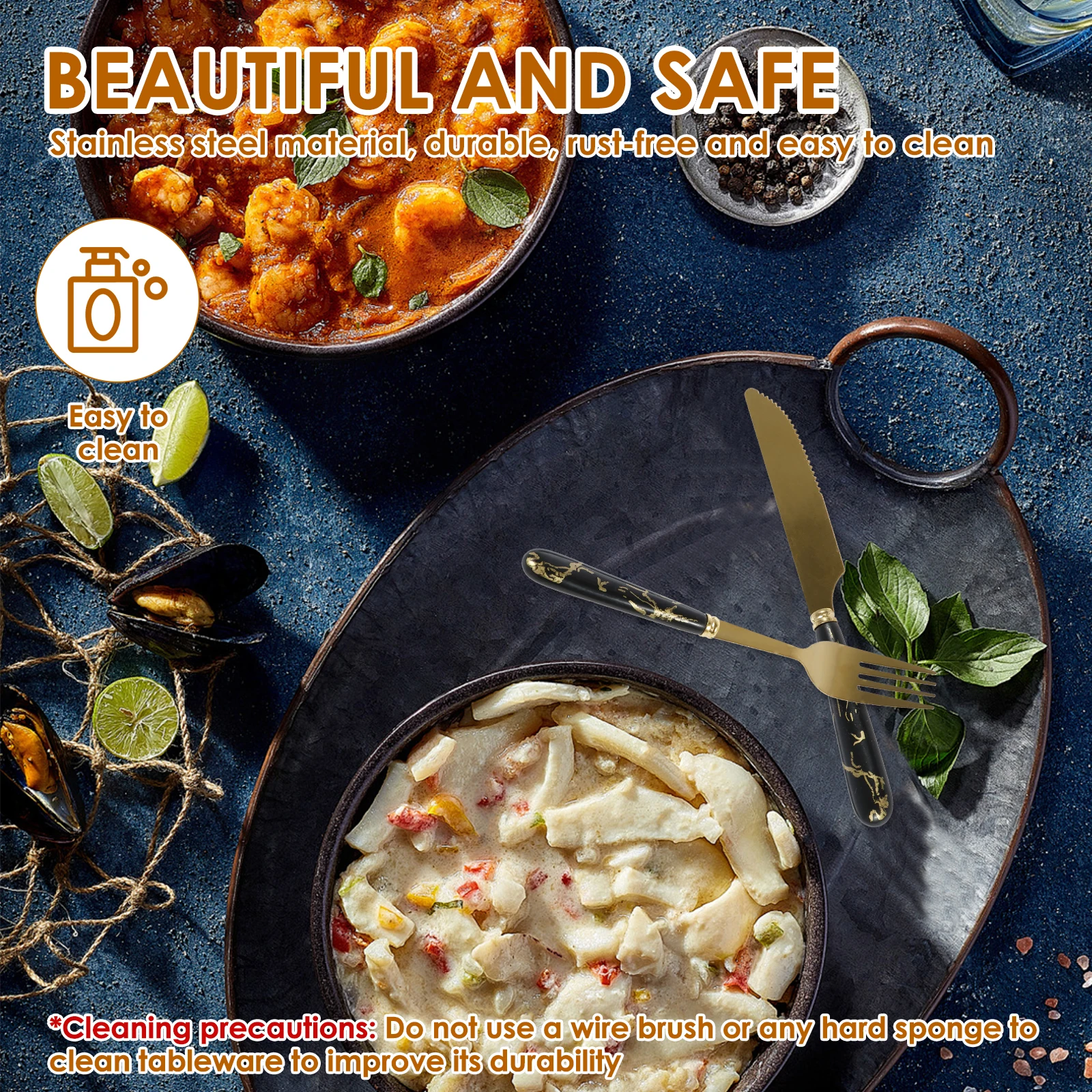 Punho antiderrapante: Os talheres no conjunto de talheres estão equipados com alças texturizadas em mármore. Estas alças são antiderrapantes e anti escaldante, com um aperto confortável que é ao mesmo tempo bonito e funcional