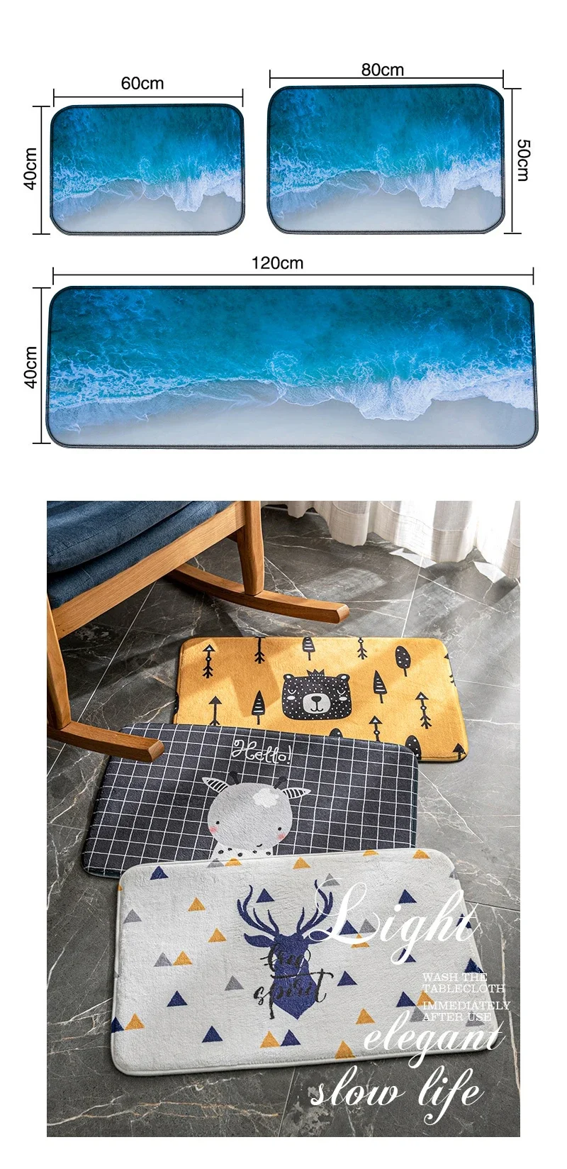 Vantagem do produto (1) macio e confortável, boa respirabilidade e anti-estática. (2) Fácil de limpar, pode ser lavado diretamente pela máquina de lavar roupa ou mão, sem desbotamento. (3) impressão ambientalmente amigável e tingimento, sem odor, sem substâncias nocivas. (4) durável e durável, boa resistência ao deslizamento, piso protetor. (5) As bordas do tapete são cuidadosamente costuradas para garantir qualidade e vida mais longa. (6) tapete pode ser personalizado de acordo com a imagem, cor, se você precisa personalizar, entre em contato conosco.