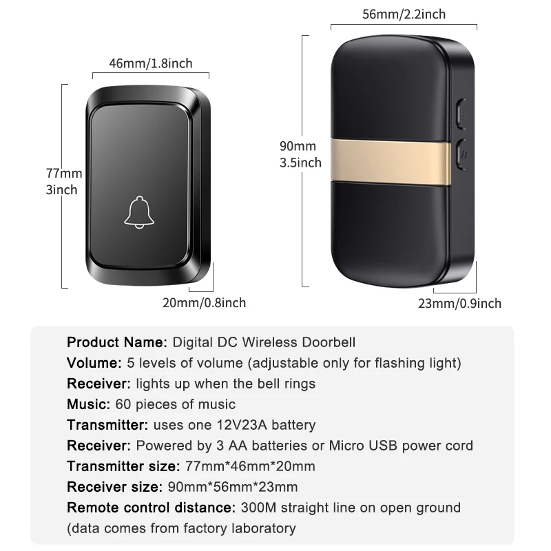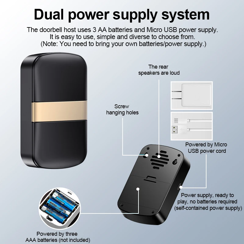 O transmissor é instalado fora da porta, e o receptor usa 3 * pilhas AAA/cabo de alimentação Micro USB para alimentar a fonte de alimentação. Pressione o transmissor para tocar a campainha, e o receptor imediatamente toca a campainha e pisca uma luz para lembrar.
