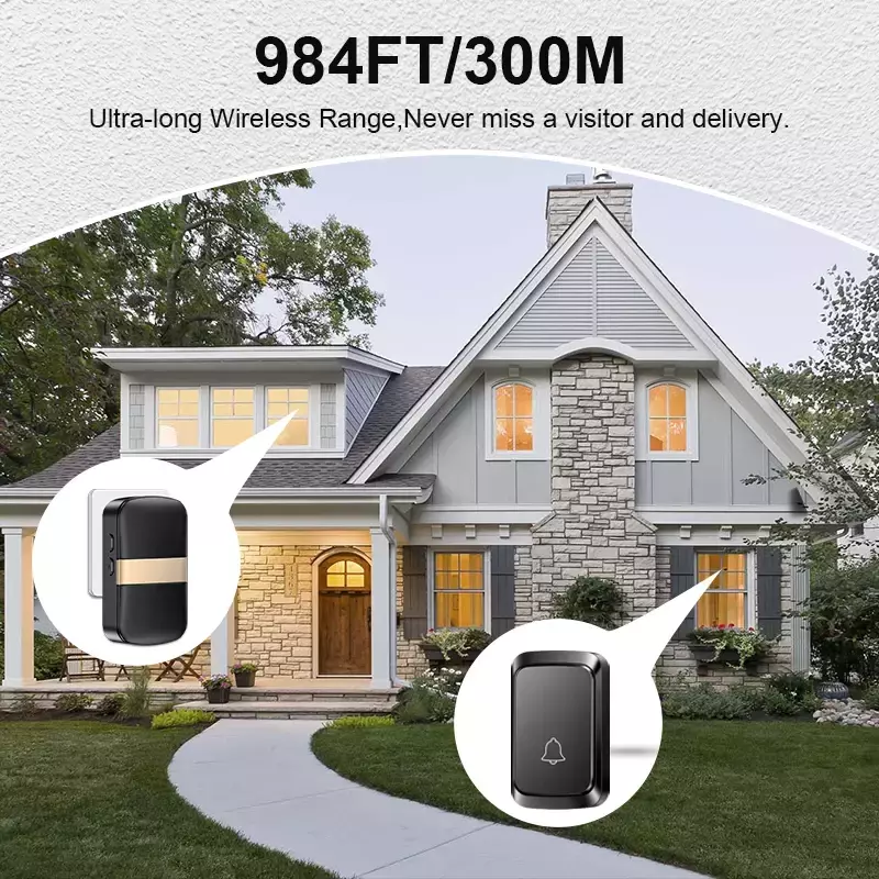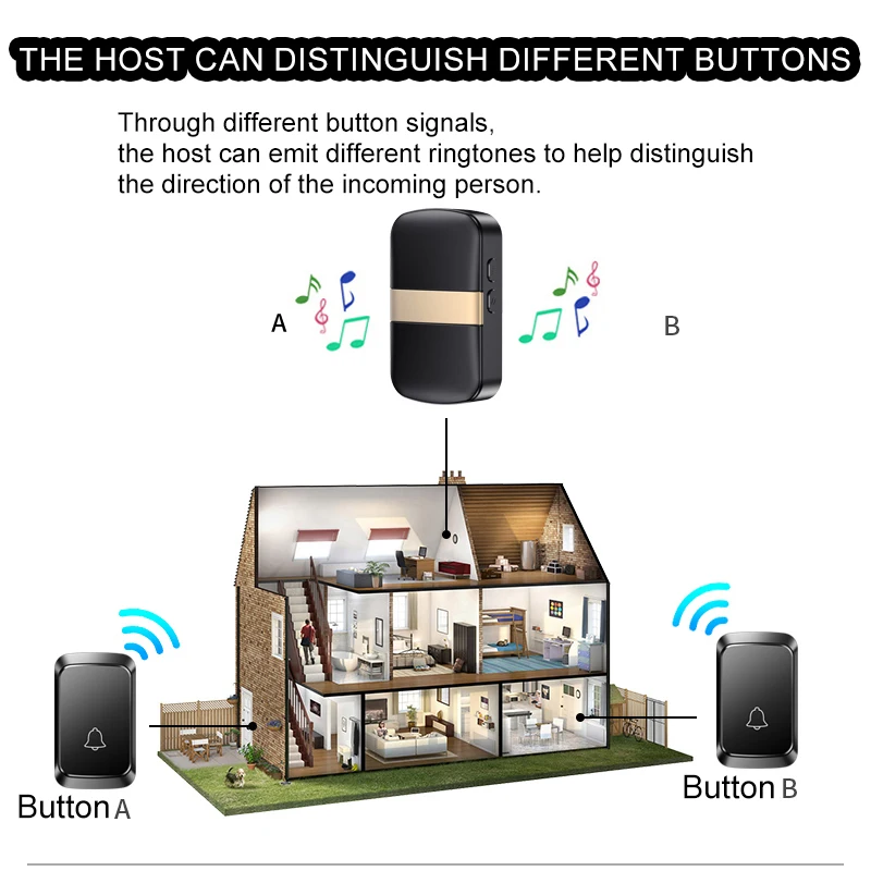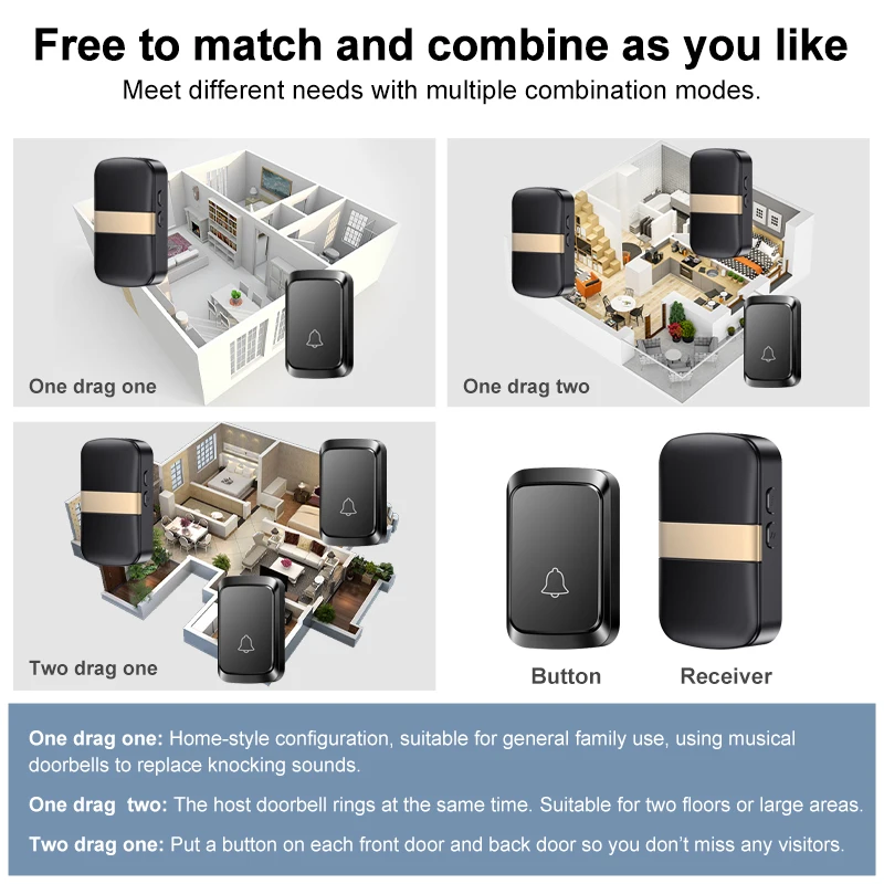 6) Suporta o uso de vários conjuntos de campainhas, Pressione qualquer botão, o toque do receptor soará e cada botão pode ser configurado com um toque diferente para distinguir os visitantes.