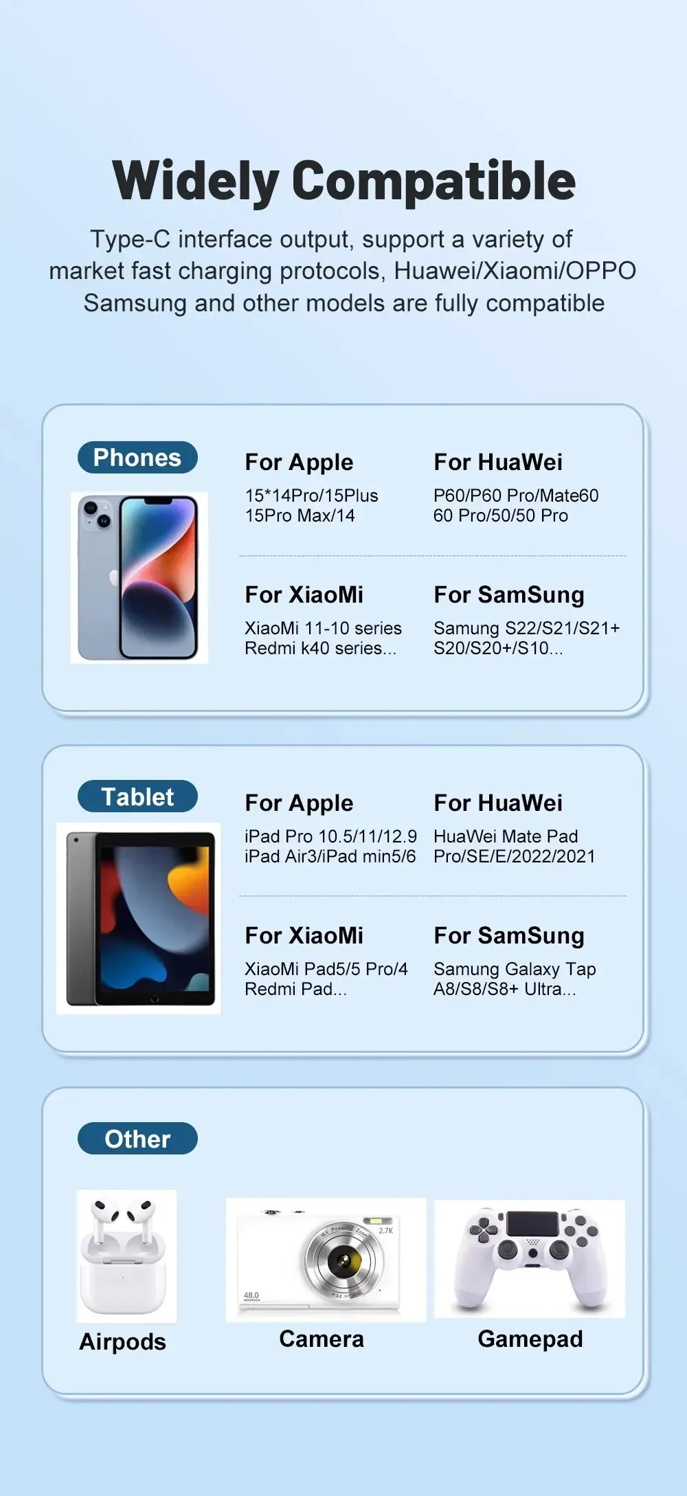 • Compatibilidade Universal: Compatível com uma ampla variedade de dispositivos, incluindo telefones celulares, tablets e outros dispositivos alimentados por USB.